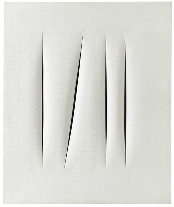 Lucio Fontana (1899–1968, born in Rosario, Argentina; activein Italy and founder of Spatialism) began cutting canvases in 1958.